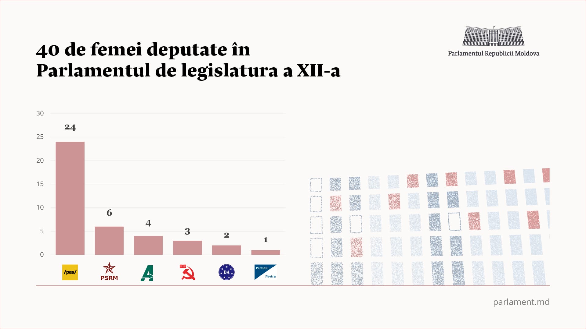În Parlamentul Republicii Moldova activează 40 de femei deputate, același număr ca în legislatura precedentă. Este cel mai mare nivel al reprezentării femeilor în legislativ de până acum, se arată într-o notă informativă.