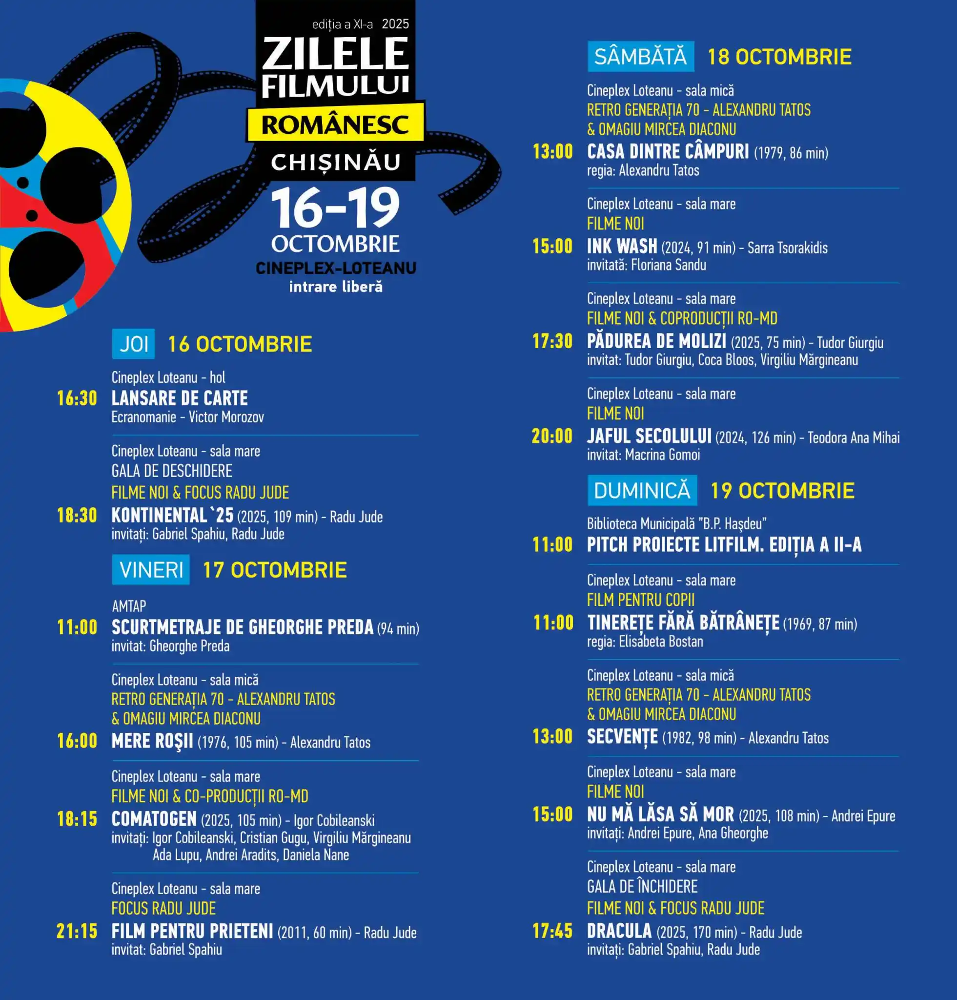 Zilele Filmului Românesc (ZFR) la Chișinău, eveniment ajuns la cea de-a 11-a ediție, va avea loc între 16 și 19 octombrie la Cineplex „Loteanu”. La festival vor putea fi vizionate cele mai așteptate filme ale anului, inclusiv propunerea României la Premiile Oscar. Intrarea la proiecții va fi gratuită, cu rezervarea prealabilă a biletelor la casieria cinematografului, anunță Ministerul Culturii al R. Moldova.
