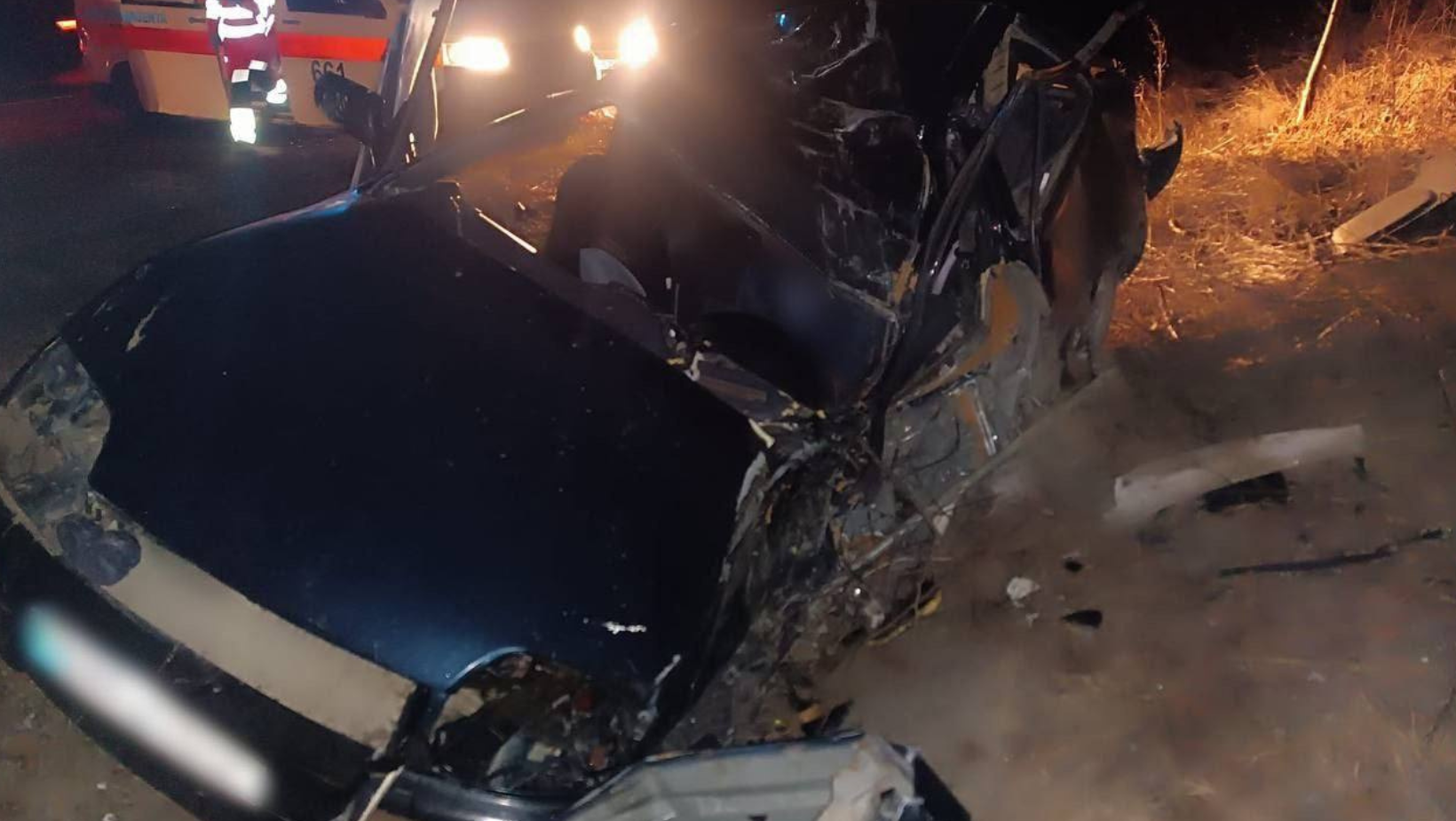 Un bărbat a rămas prins în interiorul mașinii după ce vehiculul său a derapat de pe carosabil. Impactul a deformant autoturismul, făcând imposibilă ieșirea victimei fără ajutor specializat.