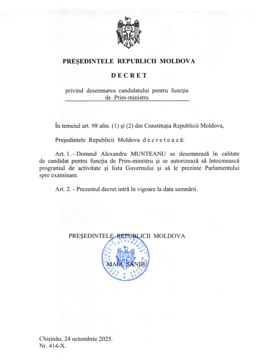 Partidul Acțiune și Solidaritate (PAS) a propus șefei statului candidatura lui Alexandru Munteanu pentru funcția de prim-ministru, în a doua zi de consultări la Președinție. La scurt timp după discuție, Maia Sandu a semnat Decretul de desemnare a omului de afaceri Alexandru Munteanu la funcția de șef al Cabinetului de miniștri.