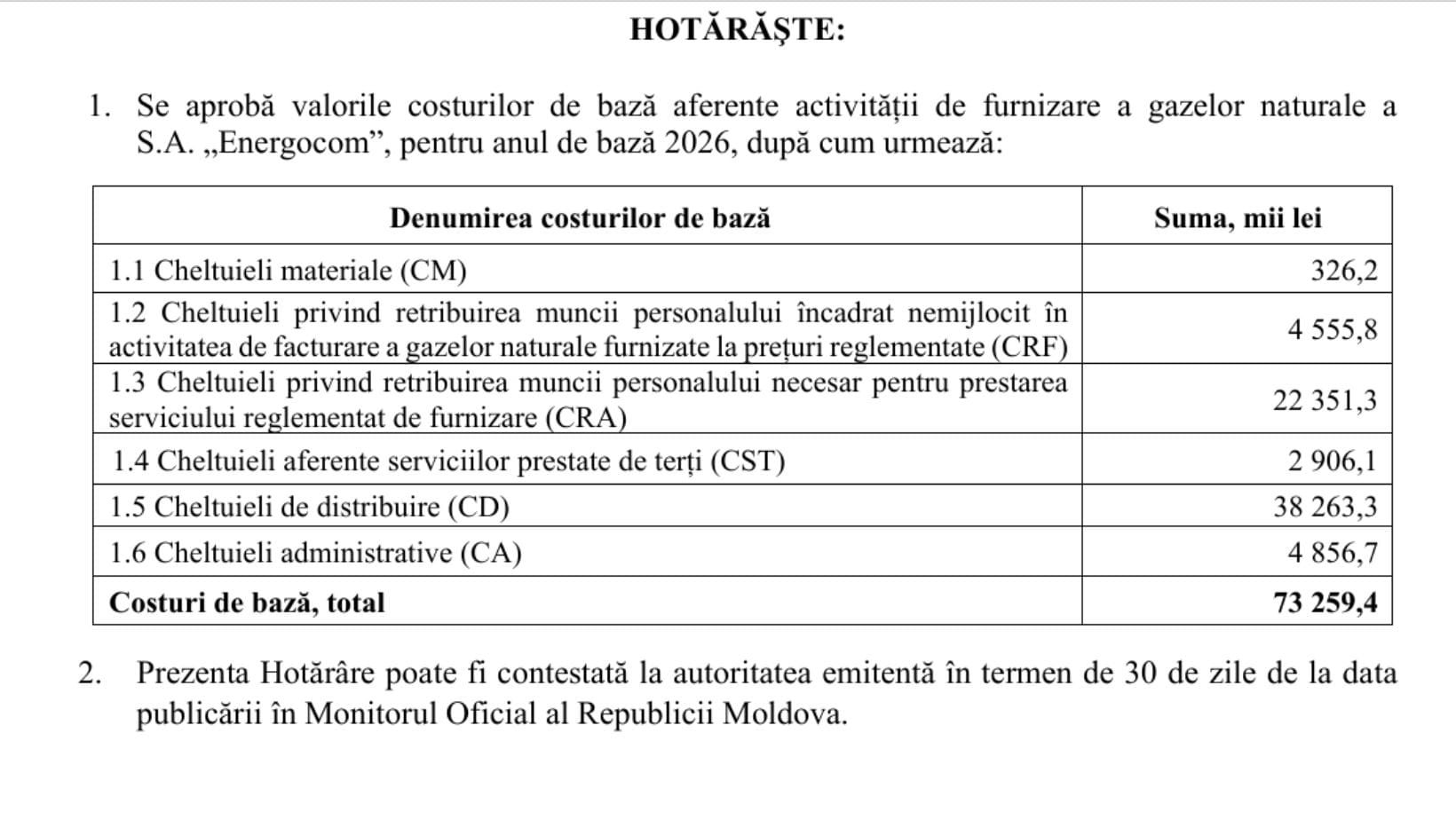 Conform documentului, S.A. „Energocom” a propus un buget total de 114,25 milioane de lei, însă ANRE a aprobat numai 73,26 milioane de lei, ceea ce echivalează cu o reducere de 40,99 milioane de lei, adică aproximativ 36% din suma solicitată.