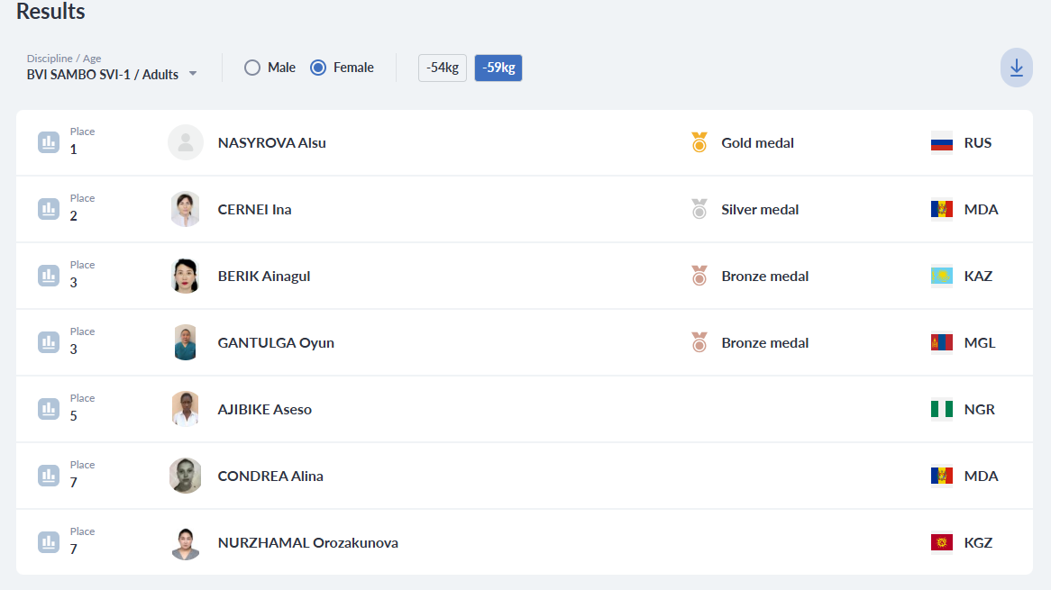 Ina Cernei a obținut argintul în categoria BVI SAMBO SVI-1 (feminin, 59 kg), iar Alexandr Ursul a câștigat bronzul în categoria BVI SAMBO SVI-1 (masculin, 64 kg).
