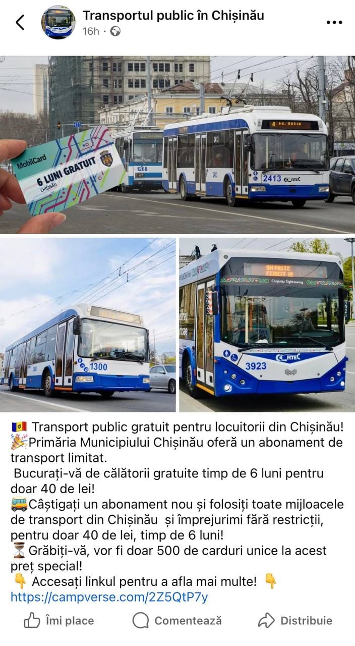 Mai exact, pe Facebook au fost publicate mai multe anunțuri în care se menționează că, plătind 40 de lei, persoanele pot obține un abonament care le-ar permite să circule gratuit cu transportul public timp de șase luni. În comentarii apar mai multe fotografii cu pretinsele abonamente.