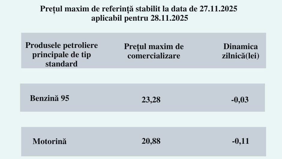 Agenția Națională pentru Reglementare în Energetică (ANRE) a publicat noile prețuri maxime de comercializare a carburanților, aplicabile începând cu 28 noiembrie 2025. Astfel, șoferii vor avea parte de noi ieftiniri, deși moderate.