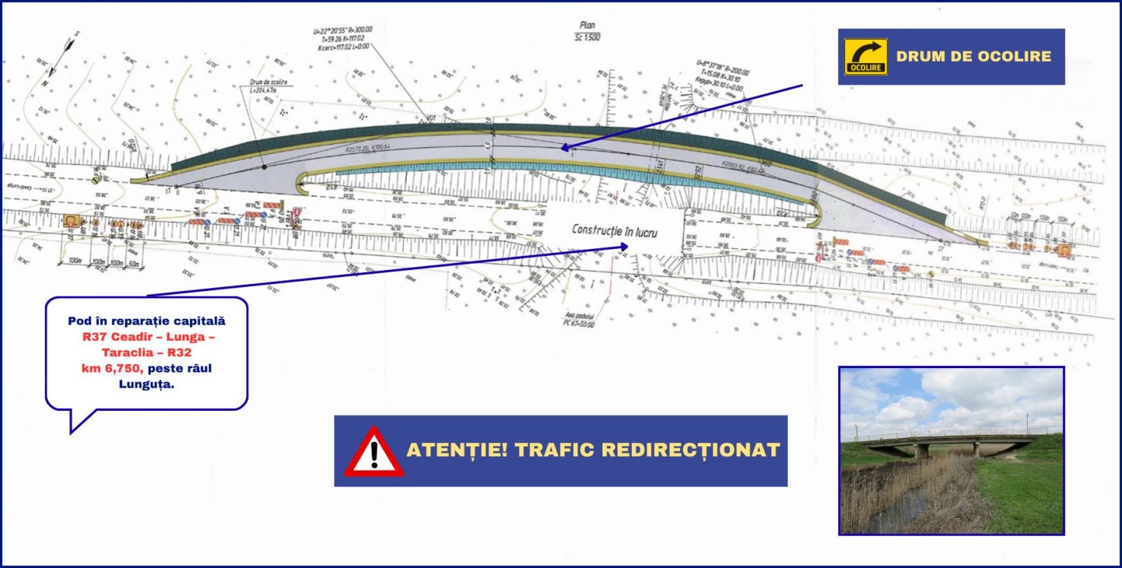 Lucrările de amenajare a drumului de ocolire temporar au fost finalizate. Pe acest traseu va fi deviată circulația rutieră pe durata execuției lucrărilor de reparație capitală a podului amplasat pe drumul R37 Ceadîr-Lunga - Taraclia-R32, la km 6,75.