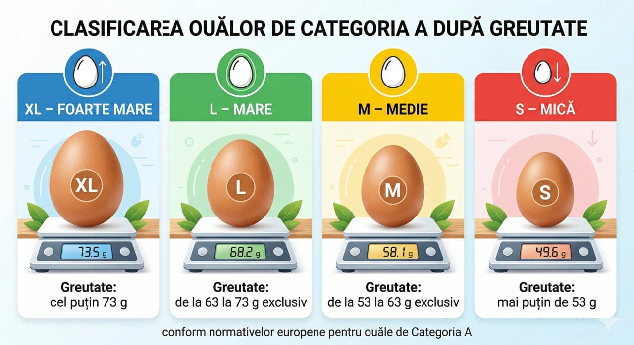 În funcție de greutate, ouăle sunt clasificate în mai multe categorii: foarte mari (peste 73 de grame), mari (între 63 și 73 de grame), medii (între 53 și 63 de grame) și mici (sub 53 de grame).
