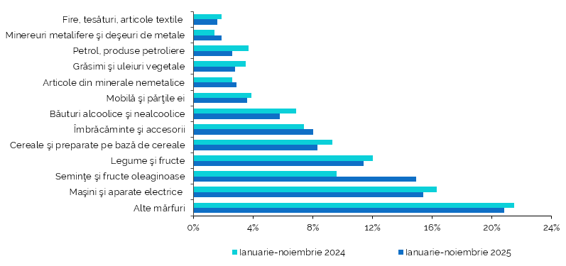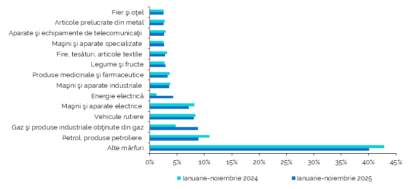 Pe parcursul celor 11 luni ale anului 2025, exporturile totale au atins aproape 3,4 miliarde de dolari, în creștere cu 4,4% comparativ cu aceeași perioadă din 2024. În același timp, importurile au depășit 9,8 miliarde de dolari, în creștere cu 19,5%, ceea ce accentuează deficitul balanței comerciale, care s-a adâncit cu aproape 30% față de anul precedent.