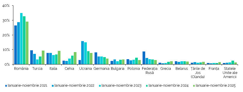 Exporturile au înregistrat o ușoară scădere - de 3,2% față de octombrie 2025, iar importurile au coborât cu 1,6%. Este un semnal că activitatea economică încetinește în pragul iernii, însă privite pe termen anual, cifrele dau un motiv de optimism: exporturile au urcat cu 18% față de noiembrie 2024, în timp ce importurile au crescut cu peste 20%, ceea ce arată că producătorii moldoveni își găsesc tot mai bine locul pe piețele externe.