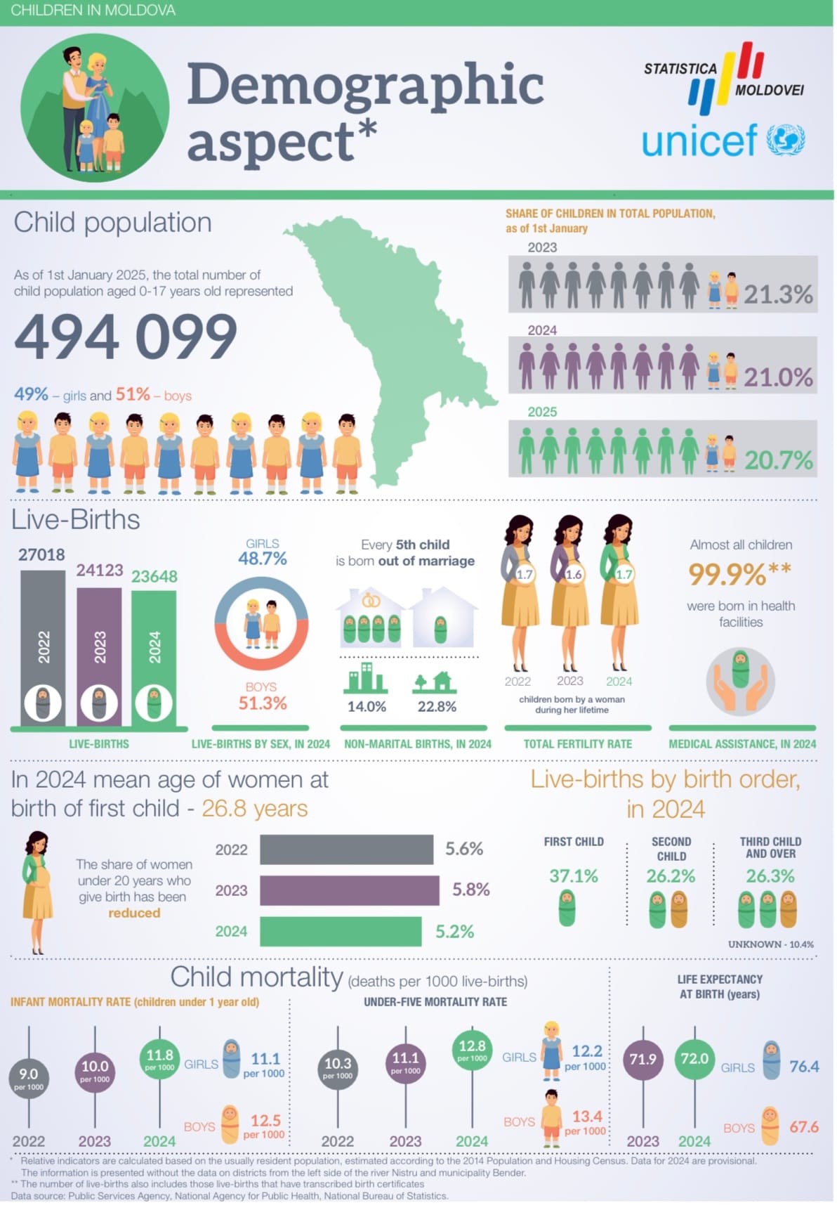 Biroul Național de Statistică (BNS) a publicat raportul anual privind situația copiilor din Republica Moldova în 2024, un document care dezvăluie o imagine mixtă: victorii modeste în educație și sănătate, dar răni adânci cauzate de scăderea populației infantile, sărăcia care lovește un copil din trei și riscurile sociale care amenință viitorul a sute de mii de minori. Cu doar 494.100 de copii sub 18 ani la începutul anului 2025 – reprezentând doar 20,7% din populația totală, tara noastră se confruntă cu o criză demografic ce ar putea submina dezvoltarea țării pe termen lung.