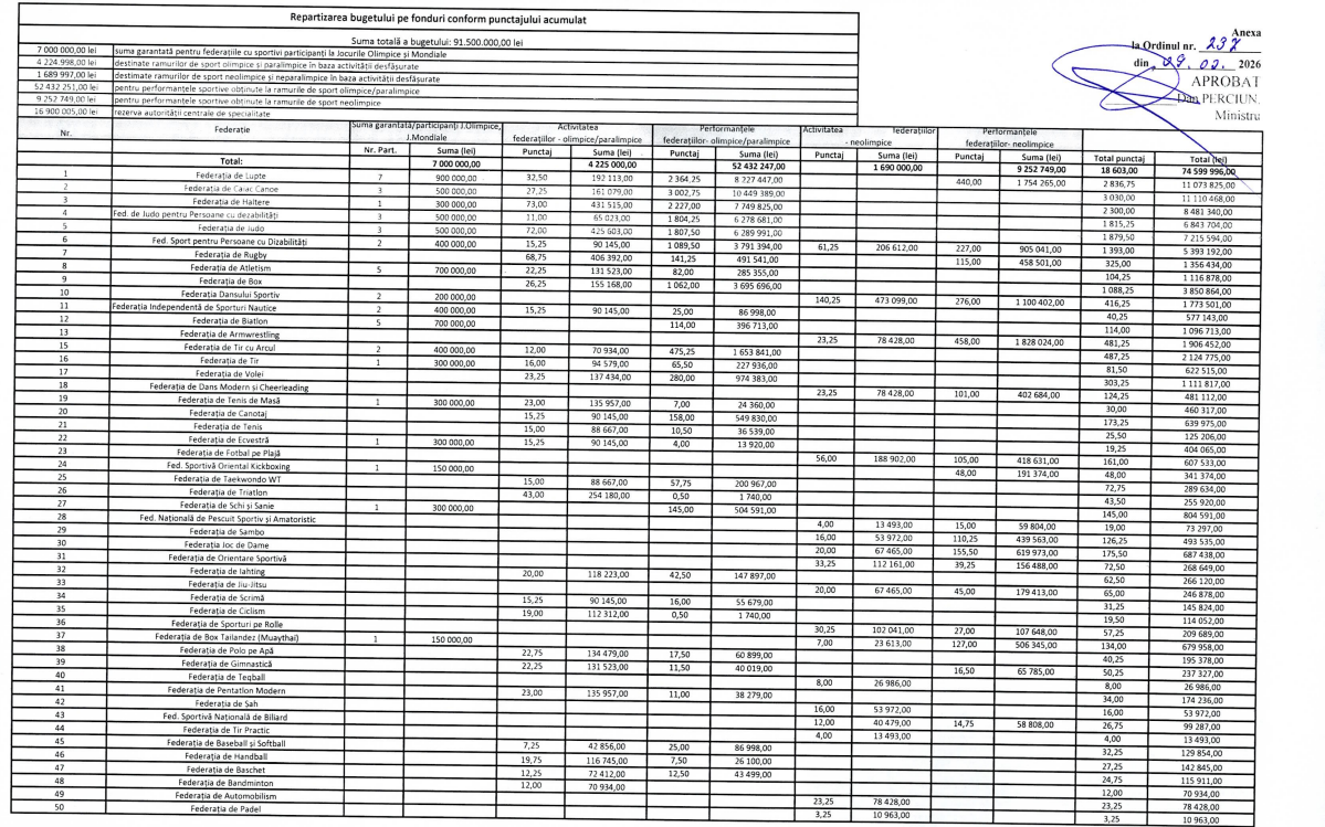 Ordinul privind finanțarea din bugetul de stat a federațiilor sportive în anul 2026, AICI.