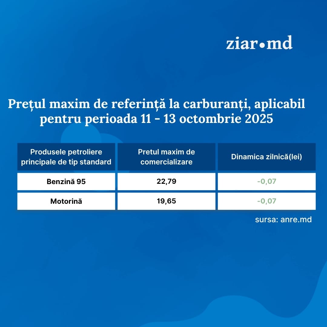 În aceste condiții, ANRE anunță că în perioada 11 - 13 octombrie 2025, benzina se va ieftine cu șapte bani și va costa 22,79 lei/litru, iar motorina se va scumpi cu șapte bani și va costa 19,65 lei/litru.