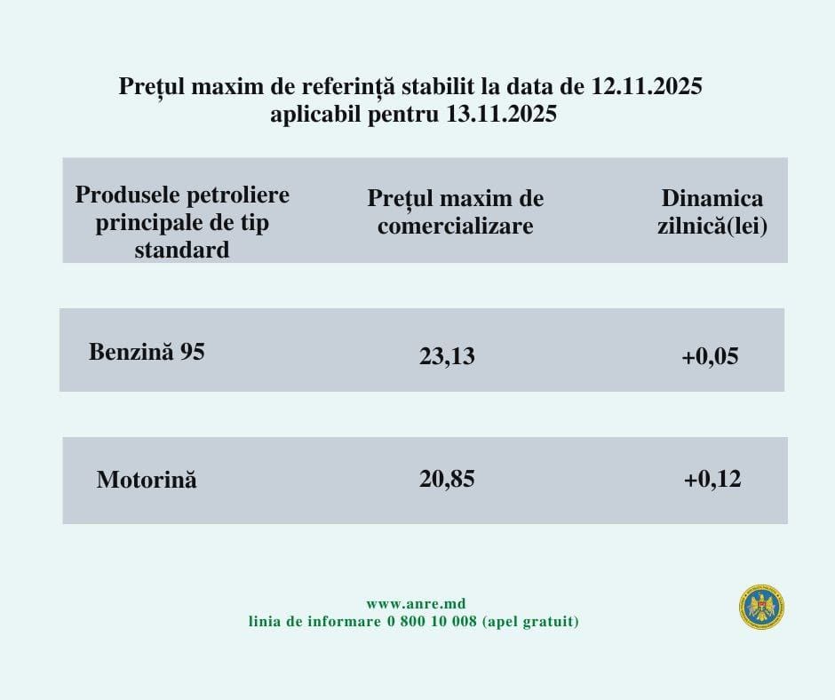 Agenția Națională pentru Reglementare în Energetică (ANRE) a publicat noile prețuri plafon la carburanți, valabile pentru ziua de joi, 13 noiembrie. Potrivit ANRE, benzina se va scumpi de la miezul nopții cu cinci bani, iar motorina - cu 12 bani.