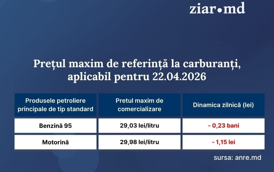 Prețul motorinei scade semnificativ pe piața carburanților din Republica Moldova, potrivit noilor valori de referință stabilite pentru data de 22 aprilie 2026 de către Agenția Națională pentru Reglementare în Energetică (ANRE).