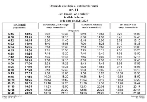Potrivit autorităților, autobuzele de pe ruta nr. 11 vor avea plecări mai dese dimineața, atât din stația inițială de pe str. Ismail, cât și din direcția orașului Durlești. Noile ore de pornire includ curse adăugate la 6:02, 6:08 și 6:19 de la Universitatea „Ion Creangă”, precum și la 6:18, 6:29 și 6:38 de la stația „Durlești, Policlinca”.