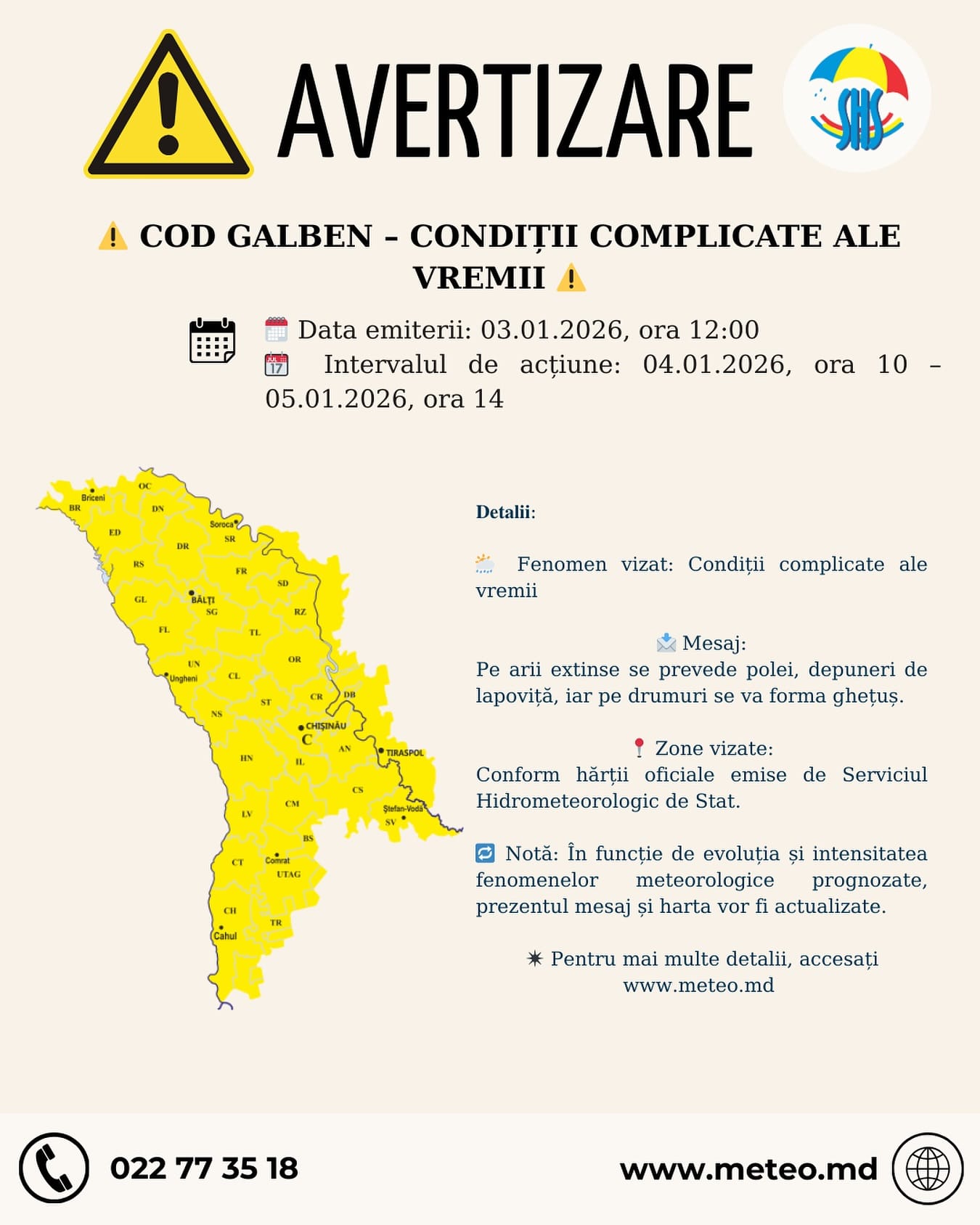 Serviciul Hidrometeorologic de Stat (SHS) a emis Cod galben de condiții complicate ale vremii. Acesta va fi valabil în perioada în perioada 4 ianuarie, ora 10:00 – 5 ianuarie, ora 14:00, pe tot teritoriul R. Moldova.