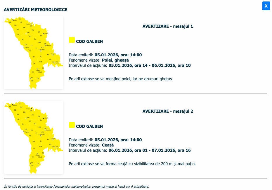 Serviciul Hidrometeorologic de Stat (SHS) a emis două avertizări meteorologice Cod galben, valabile în următoarele zile, care vizează polei, ghețuș și ceață densă pe întreg teritoriul Republicii Moldova.