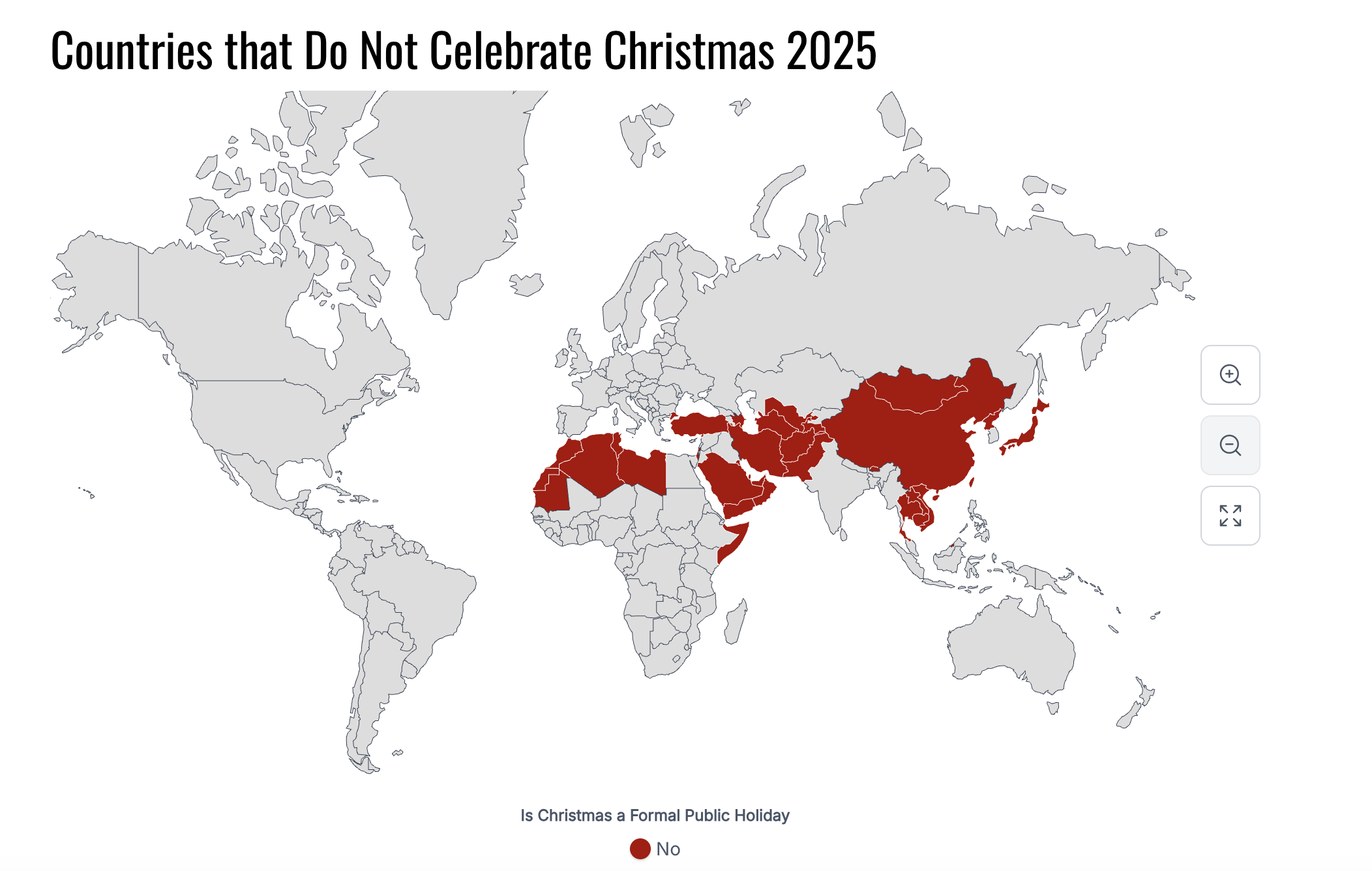 Potrivit World Population Review, o platformă online care oferă date, statistici și analize demografice la nivel global, lista completă a țărilor care nu recunosc Crăciunul ca sărbătoare națională, include și China, Pakistan, Vietnam, Turcia, Algeria, Maroc, Tunisia, Emiratele Arabe Unite, Oman, Qatar, Bahrain, Kuweit, Brunei, Bhutan și altele.