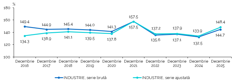Industria prelucrătoare a contribuit și ea la creșterea totală, cu un avans de 19,3% în decembrie, mai ales în sectoarele alimentare, textile și echipamente mecanice. Aceste creșteri reflectă o mai bună valorificare a materiilor prime disponibile și adaptarea la cererea internă și de export, menționează BNS.
