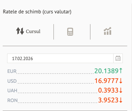 Banca Națională a Moldovei (BNM) a afișat pentru 17 februarie un curs valutar cu mici modificări față de ziua precedentă, 16 februarie. Euro a înregistrat o ușoară creștere, în timp ce dolarul american, hrivna ucraineană și leul românesc s-au ieftinit, la fel, nesemnificativ.