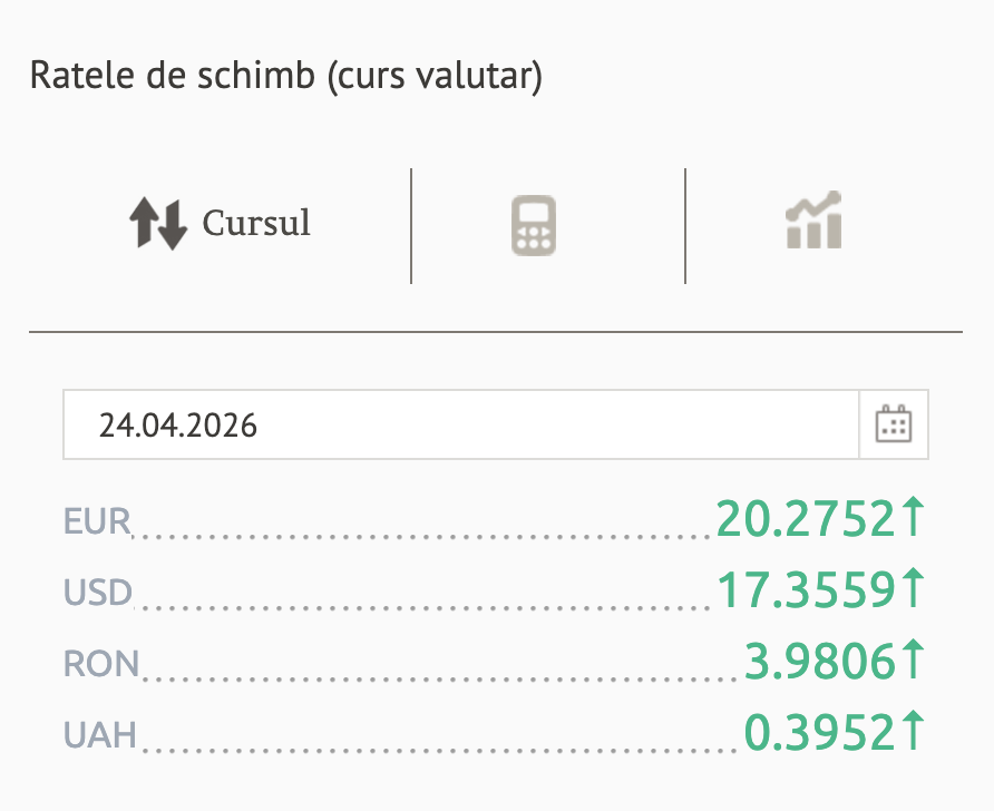 Leul moldovenesc s-a depreciat ușor pe 24 aprilie față de ziua precedentă, potrivit cursului oficial al Băncii Naționale a Moldovei.