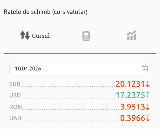 Banca Națională a Moldovei (BNM) a publicat ratele de schimb oficiale pentru vineri, 10 aprilie 2026. Comparativ cu joi, 9 aprilie, euro și leul românesc s-au depreciat ușor față de leu, în timp ce dolarul american a înregistrat o creștere.