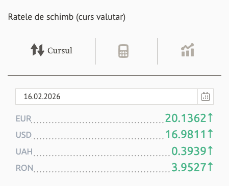 Banca Națională a Moldovei (BNM) a stabilit pentru ziua de luni, 16 februarie, un curs valutar în ușoară creștere pentru principalele valute de referință.