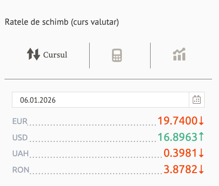 Pentru luni, 6 ianuarie 2026, Banca Națională a Moldovei (BNM) a publicat noile cursuri de schimb valutar. Comparativ cu ziua precedentă, leul moldovenesc s-a întărit ușor în fața monedei euro, dar a pierdut teren în fața dolarului american.