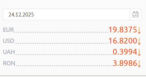 Potrivit cursului oficial stabilit de Banca Națională a Moldovei (BNM) pentru astăzi, 24 decembrie, un euro este cotat la 19 lei și 83 de bani, cu un ban mai puțin comparativ cu ziua precedentă.