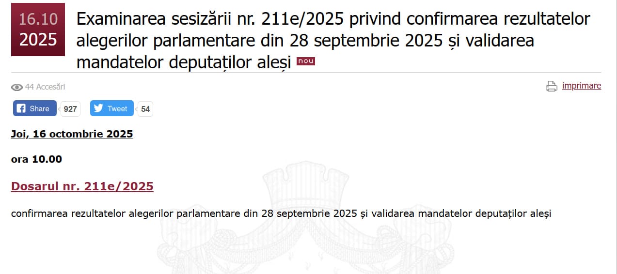 Curtea Constituțională (CC) se va pronunța în privința rezultatelor alegerilor parlamentare pe 16 octombrie. Tot atunci, CC va decide dacă validează mandatele deputaților aleși.