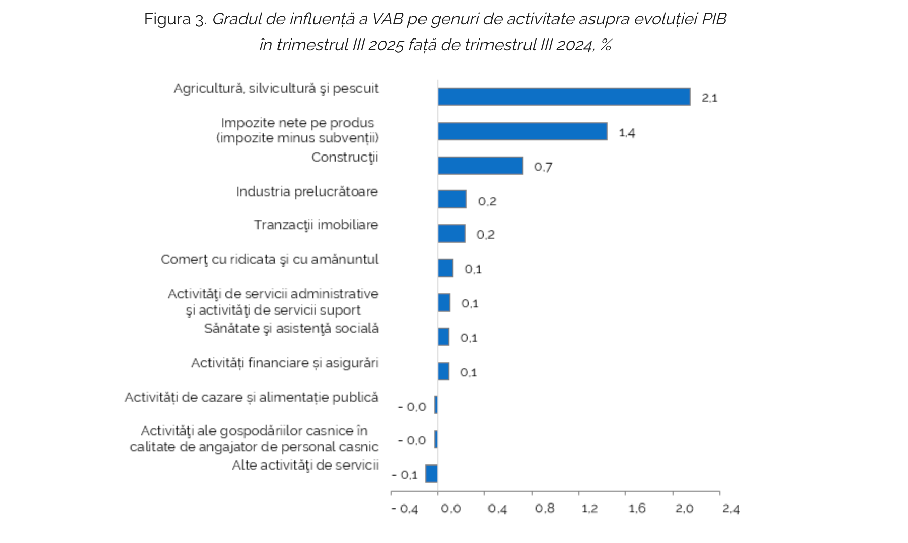 Datele BNS mai arată că, în același timp, unele domenii au tras economia în jos. Activitățile de cazare și alimentație publică, serviciile financiare și alte servicii au avut contribuții negative asupra evoluției PIB în trimestrul III.