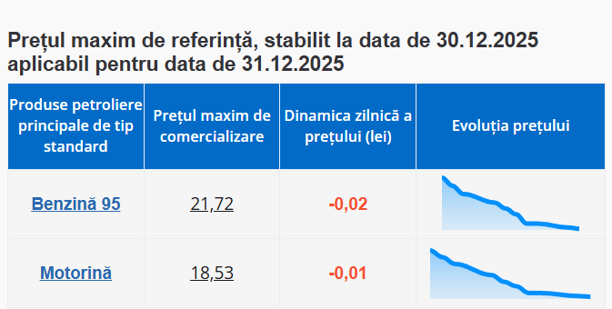 ANRE informează că, de Revelion, benzina standard 95 va avea un preț maxim de 21,72 lei pe litru, în scădere cu doi bani față de ziua precedentă, iar motorina se va vinde cu 18,53 lei pe litru, mai ieftină cu un ban.