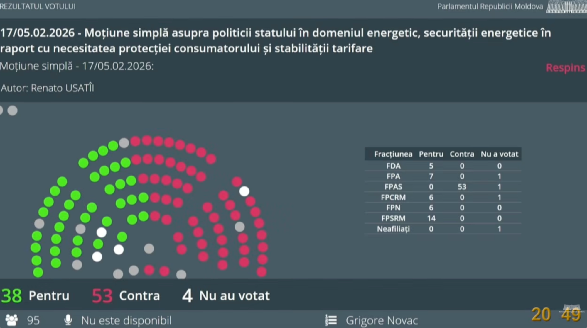 Parlamentul a respins moțiunea simplă asupra politicii statului în domeniul energetic. Inițiativa a întrunit 53 de voturi „Contra”, 38 de voturi „Pentru”, iar 4 s-au abținut, respectiv, nu a acumulat numărul necesar de voturi. Documentul viza securitatea energetică, protecția consumatorilor și stabilitatea tarifelor.