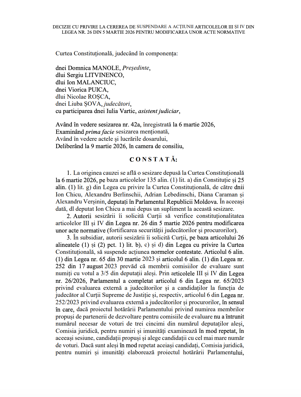 Sesizarea a fost depusă de mai mulți deputați din opoziție, care au cerut Curții să verifice constituționalitatea articolelor III și IV din Legea nr. 26 din 5 martie 2026. Aceștia au solicitat, totodată, ca până la examinarea cauzei prevederile contestate să fie suspendate.