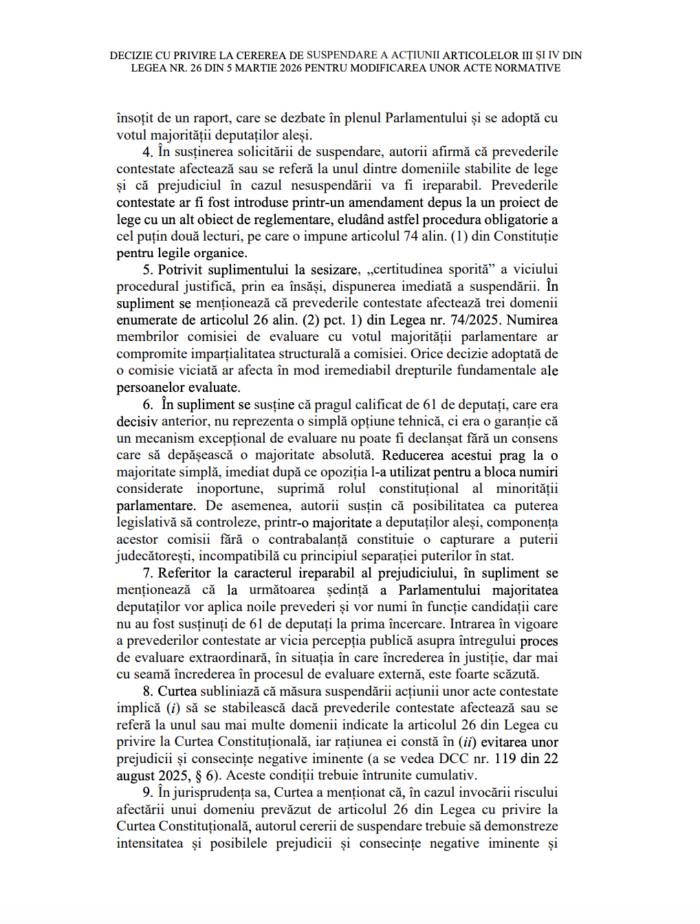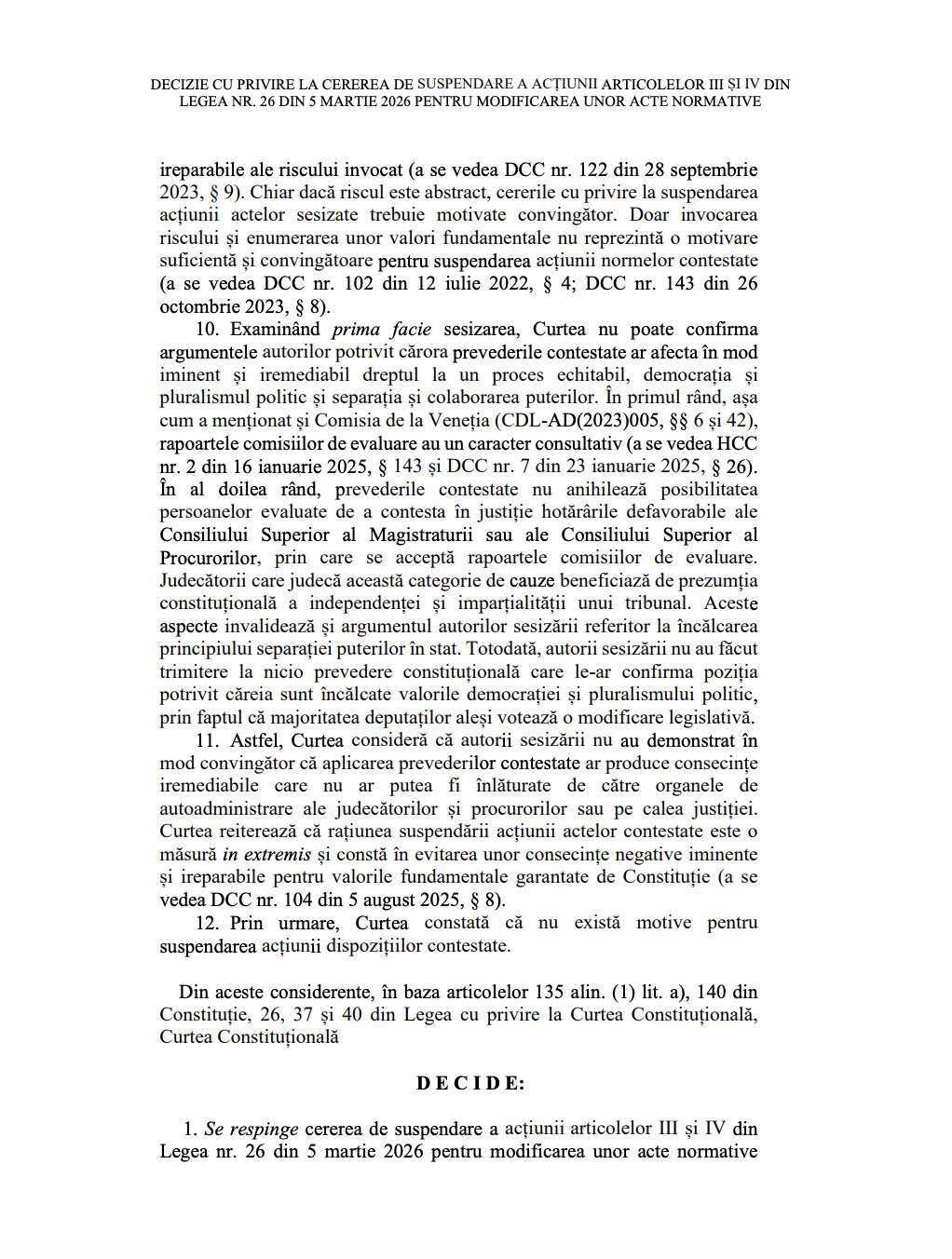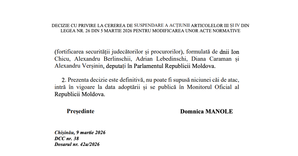 Prin urmare, Curtea a decis respingerea cererii de suspendare a prevederilor contestate. Decizia este definitivă, nu poate fi atacată și intră în vigoare la data adoptării. Documentul urmează să fie publicat în Monitorul Oficial.