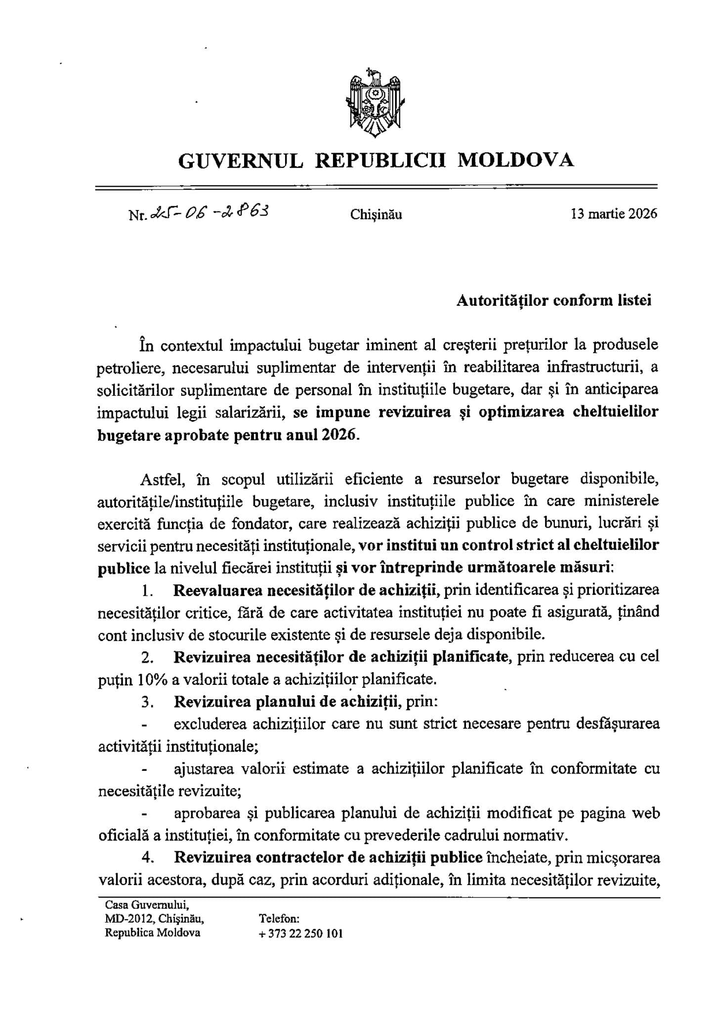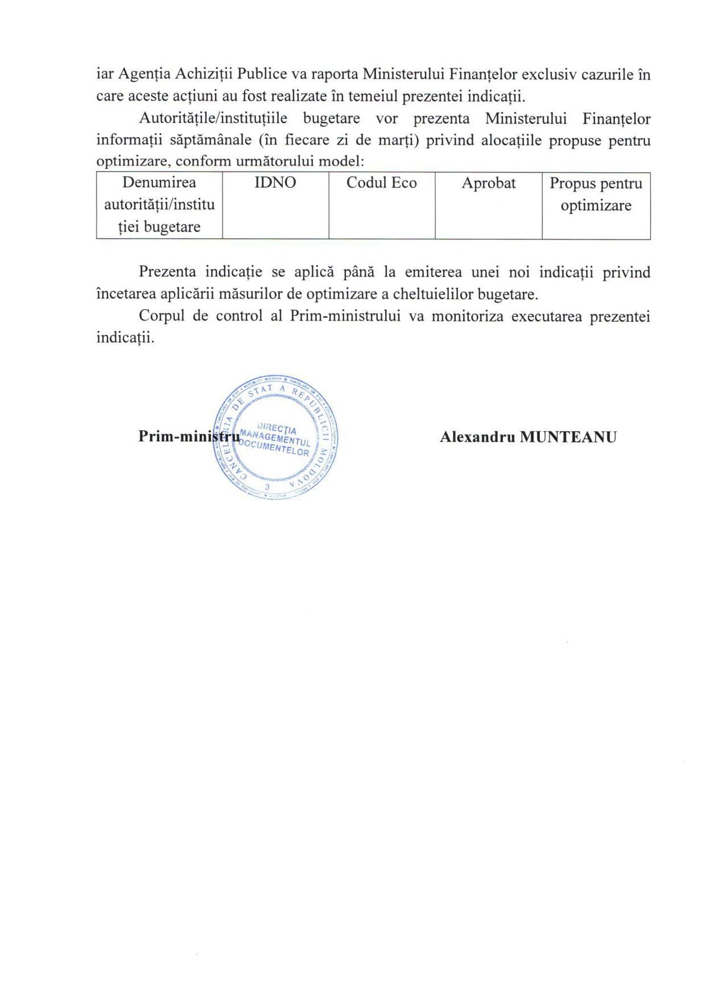 De asemenea, conform Dispoziției semnate de Munteanu, autoritățile publice vor evita majorarea salariilor, creșterea numărului de angajați sau crearea de noi unități.