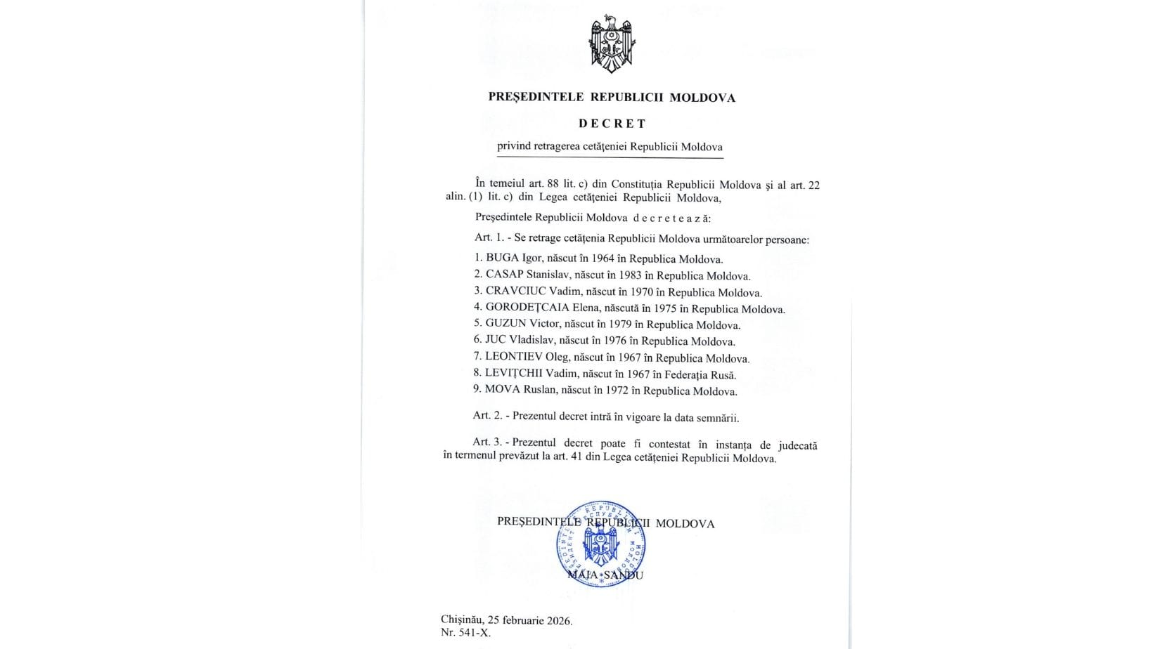 Nouă persoane au rămas fără cetățenia Republicii Moldova, după ce șefa statului, Maia Sandu, a semnat pe 25 februarie un decret în acest sens. Este vorba despre cetățeni care au deținut și continuă să dețină diferite funcții în cadrul așa-numitelor entități neconstituționale din stânga Nistrului. Totodată, doi dintre cei vizați au luptat de partea separatiștilor în războiul de pe Nistru din 1992.