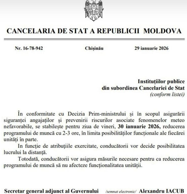 Guvernul Republicii Moldova a decis reducerea programului de lucru pentru instituțiile publice în ziua de vineri, 30 ianuarie, ca măsură preventivă în contextul condițiilor meteorologice nefavorabile prognozate pentru următoarele zile. Decizia a fost luată în urma unei ședințe a Centrului Național de Management al Crizelor (CNMC), convocată joi, 29 ianuarie, ca răspuns la avertizările meteorologice care vizează perioada 30 ianuarie - 2 februarie 2026.