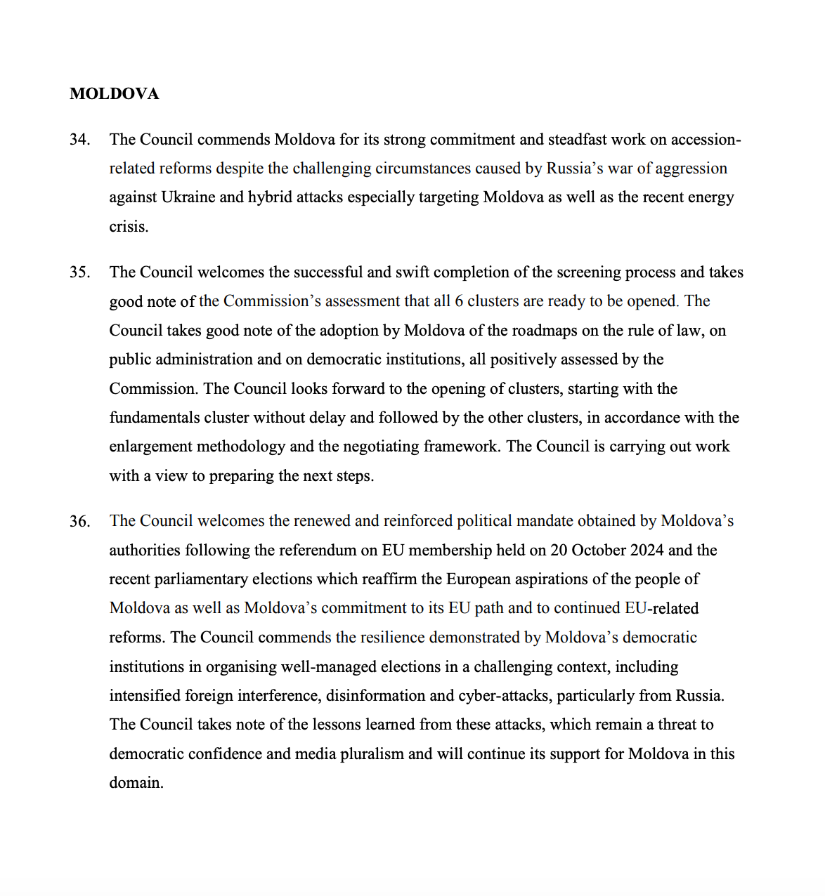 Potrivit concluziilor, Uniunea Europeană apreciază „angajamentul ferm și eforturile constante” ale Republicii Moldova în implementarea reformelor legate de aderare, în condițiile războiului declanșat de Rusia împotriva Ucrainei, ale atacurilor hibride și ale crizei energetice recente.