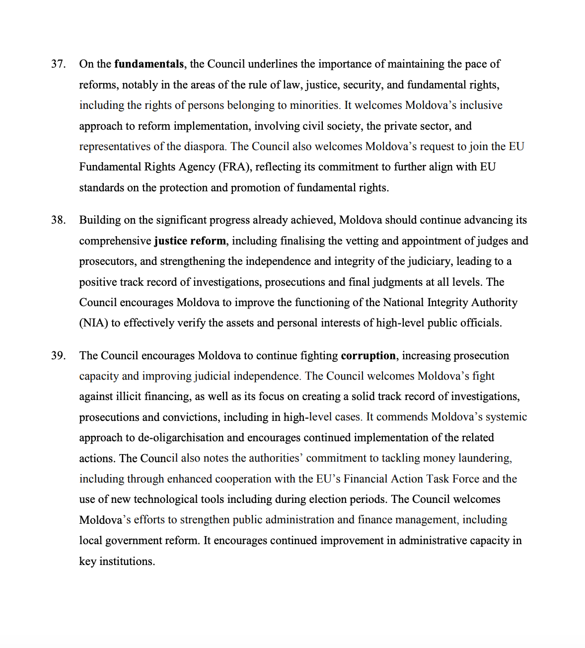 În document se subliniază că reforma justiției rămâne una dintre prioritățile-cheie ale parcursului european. Consiliul UE încurajează continuarea evaluării judecătorilor și procurorilor, consolidarea independenței sistemului judiciar și obținerea unor rezultate clare în combaterea corupției, inclusiv la nivel înalt. Sunt menționate și așteptările privind îmbunătățirea activității Autorității Naționale de Integritate și crearea unui istoric solid de investigații și condamnări.