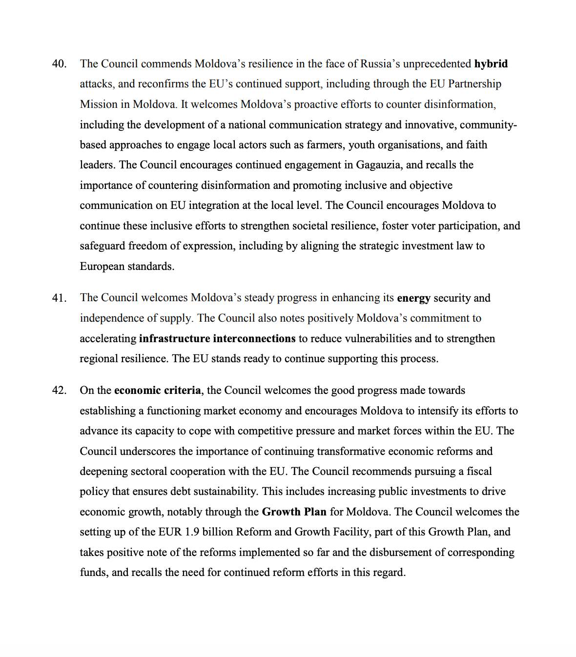 Uniunea Europeană apreciază, de asemenea, pașii făcuți de Republica Moldova pentru întărirea securității energetice și reducerea dependențelor, precum și progresele înregistrate în dezvoltarea unei economii de piață funcționale. Bruxelles-ul reamintește sprijinul oferit prin Planul de Creștere pentru Moldova și prin Facilitatea de Reformă și Creștere, în valoare de 1,9 miliarde de euro.