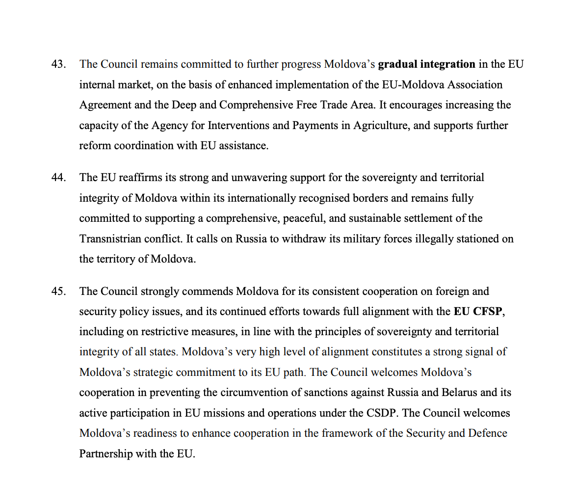 În plan extern și de securitate, Consiliul UE reconfirmă sprijinul ferm pentru suveranitatea și integritatea teritorială a Republicii Moldova și solicită Federației Ruse retragerea trupelor staționate ilegal în regiunea transnistreană. De asemenea, este apreciat nivelul foarte ridicat de aliniere a Chișinăului la politica externă și de securitate comună a Uniunii Europene.