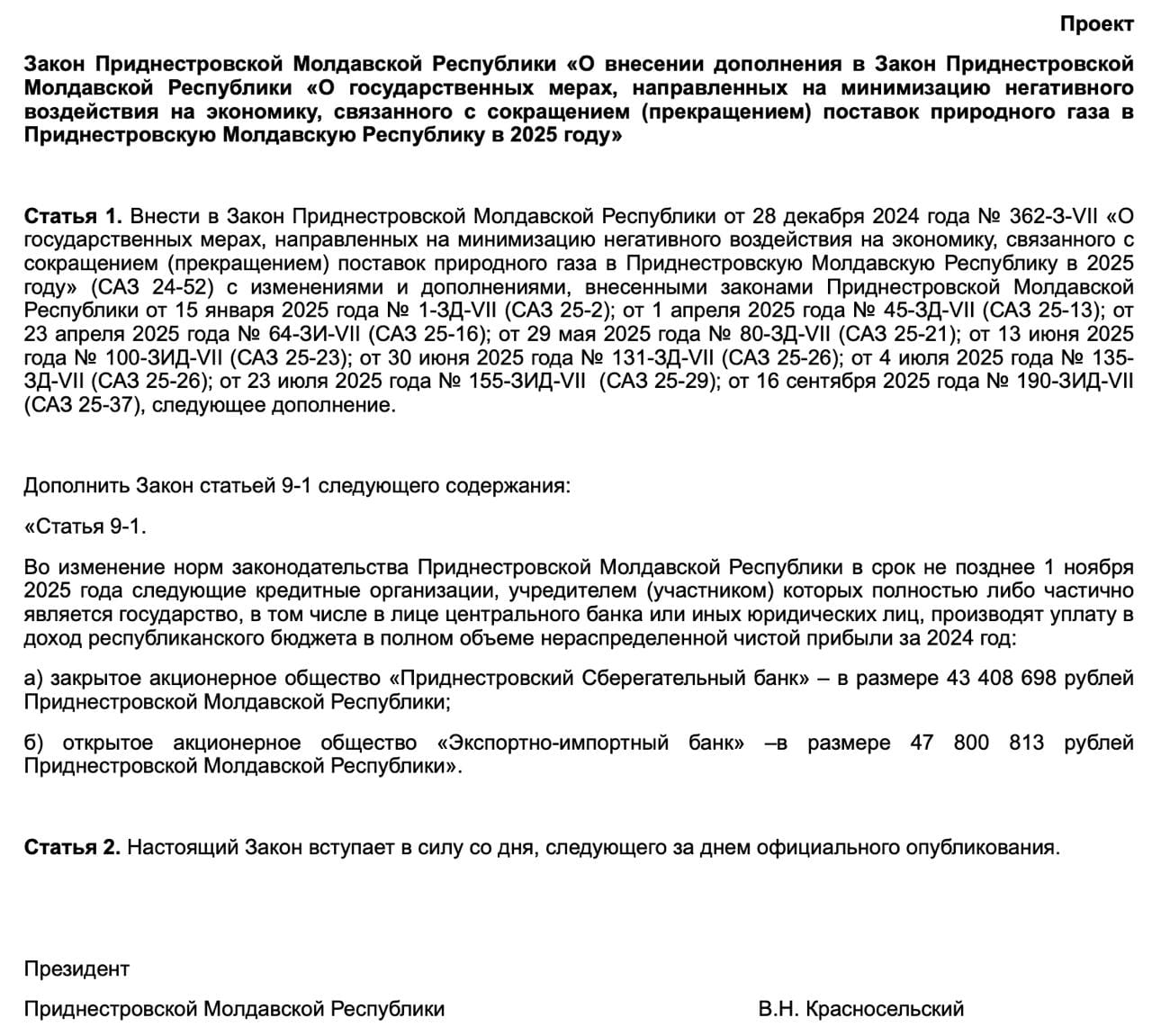Modificările la actuala „lege anticriză” prevăd transferul a aproximativ 91 de milioane de ruble transnistrene la bugetul regiunii: 43,4 milioane de la „Banca de Economii a Transnistriei” și 47,8 milioane de la „Banca de Export-Import”.