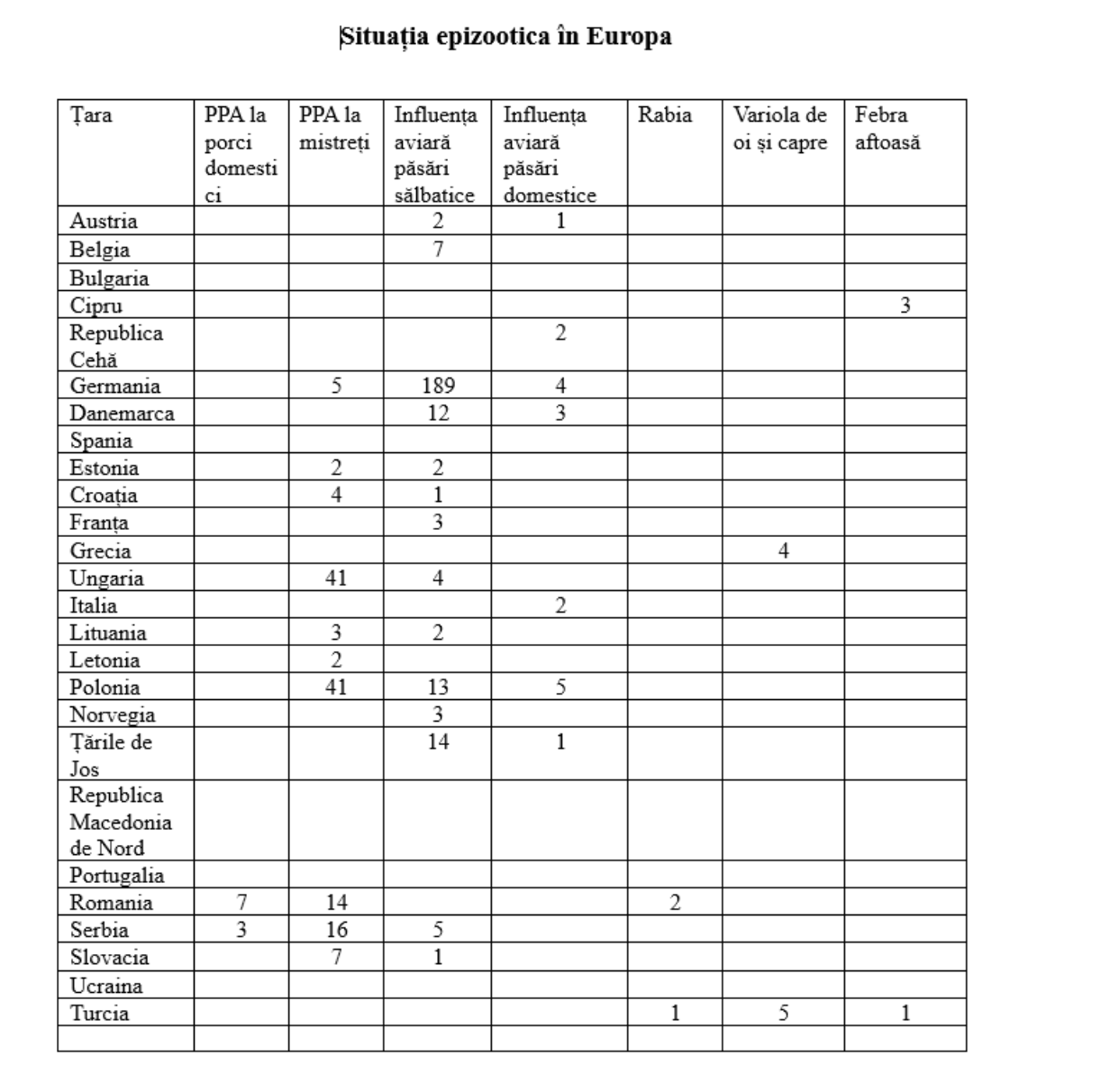 ANSA a publicat și un tabel privind situația epizootică în Europa, care arată că pesta porcină africană, gripa aviară și rabia sunt prezente în mai multe state europene. De exemplu, România a raportat focare atât la porci domestici, cât și la mistreți, precum și cazuri de rabie. Totodată, Germania, Polonia, Ungaria și Serbia au înregistrat zeci de focare de PPA. În mai multe țări au fost confirmate cazuri de gripă aviară la păsări sălbatice și domestice.