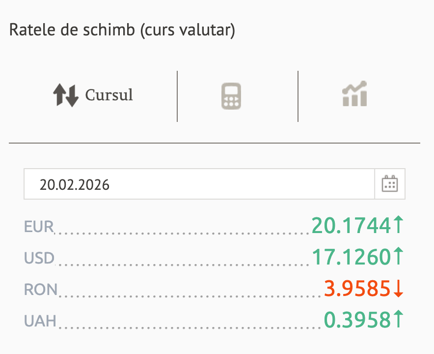 Banca Națională a Moldovei (BNM) a publicat cursul oficial pentru 20 februarie, iar principalele valute au înregistrat mișcări ușoare față de ziua precedentă, 19 februarie.