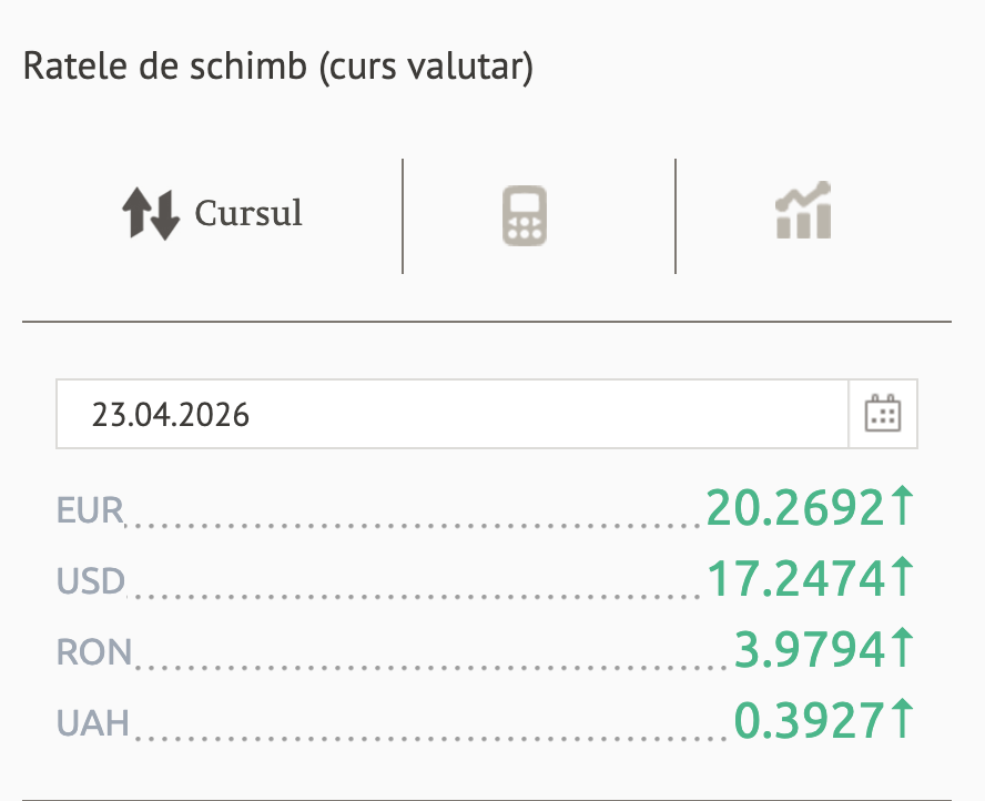 Banca Națională a Moldovei a stabilit pentru 23 aprilie un curs valutar ușor mai mare pentru principalele valute, comparativ cu ziua precedentă.