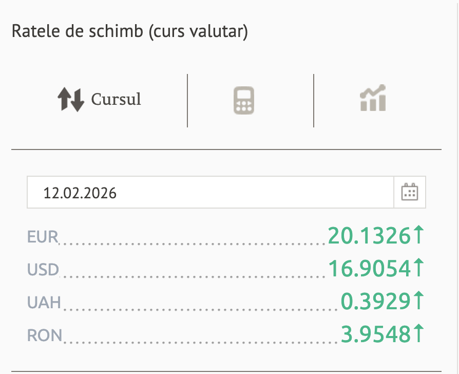 Potrivit BNM, euro va avea valoarea de 20,13 lei, în creștere cu aproximativ 1 ban față de miercuri. Dolarul american ajunge la 16,90 lei, practic fără schimbări vizibile, diferența fiind sub 1 ban.