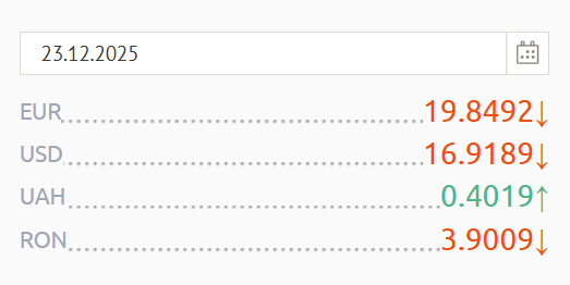 Potrivit cursului oficial stabilit de Banca Națională a Moldovei (BNM) pentru astăzi, 23 decembrie, un euro este cotat la 19 lei și 84 de bani, cu un ban mai puțin decât ieri.