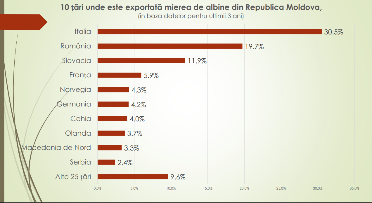 Analiza exporturilor prezentată de către Veaceslav Ioniță relevă faptul că principalele piețe de desfacere pentru mierea moldovenească, în ultimii trei ani, au fost Italia, România și Slovacia, urmate de Franța, Norvegia și Germania.