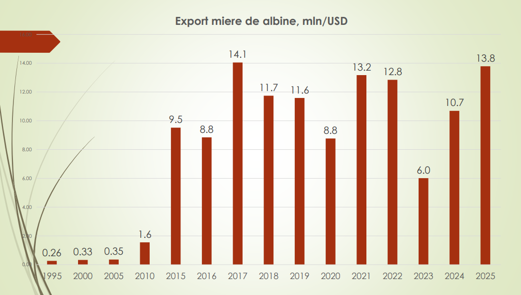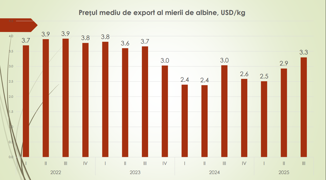 Sectorul a fost parțial salvat de creșterea prețurilor de export și de valorificarea stocurilor acumulate în anii precedenți. Astfel, în 2025 exporturile de miere sunt estimate la 13,8 milioane de dolari, în creștere față de 2024, dar încă sub nivelul maxim atins în 2017. În total, aproximativ 4,5 mii de tone de miere au fost exportate, dintre care circa 2 mii de tone au provenit din rezervele anilor anteriori.