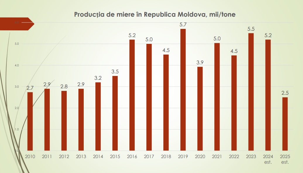 Potrivit expertului, înghețurile severe din primăvara anului trecut au afectat grav flora meliferă, determinând o înjumătățire a producției apicole. Estimările arată că în 2025 producția de miere a scăzut la aproximativ 2,5 mii de tone, un nivel comparabil cu cel din anul 2010 și cel mai scăzut din ultimii 10–15 ani.